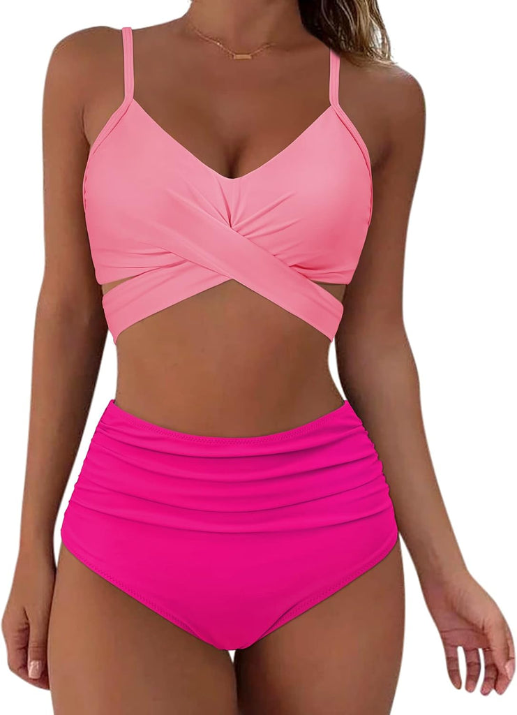 Cross Push Up Bikini Top: Tie back wrap straps, Adjustable spaghetti straps, Built-in paddingRuched Tummy Control Swimsuits Bottom: High waist, Ruching front, Modest CoverageMaterial: Polyester + Spandex, Full lined, Soft and stretchyOccasion: Swimming, Tropical vacation, Beach party, CruiseSize: (Our Size Chart) Small=US 4-6, Medium=US 8-10, Large=US 12-14, X-large=US 16-18