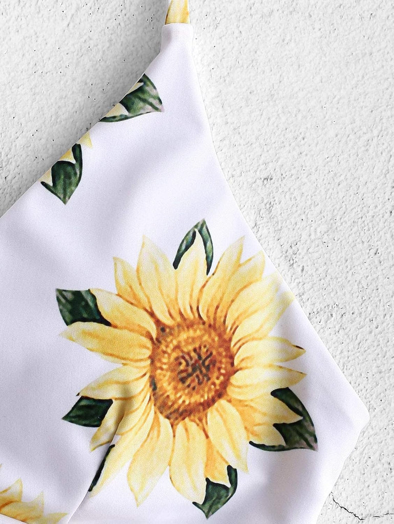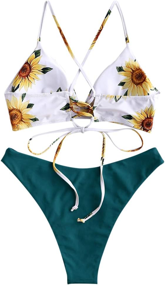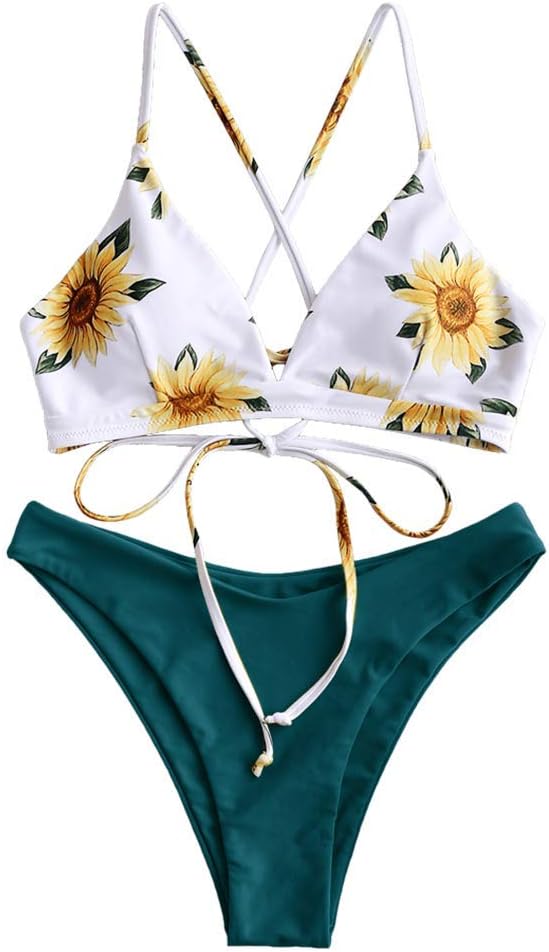 Material: 85% polyester, 15% spandex, soft fabric with good elasticity and high stretch, comfortable to wearBalmy sunflower print and slick v-neck, padded bra, fastened at the back with crisscross straps and lace up tie, solid mid rise bottoms with high cut legs for an elongating effectTwo piece crossing high cut bathing suit with flower printing pattern and crossing back design. Grab people eyes with this cheeky bikini in your vacationOccasions: sexy womens string bikini set is best summer outfits for swimming, SPA, water park, surfing, bathing, beachwear, beach party, pool party, tropical vacation and honeymoonSize: S - US 4, M - US 6, L - US 8/10. Please refer to our size chart picture before purchasing to achieve the perfect fit.