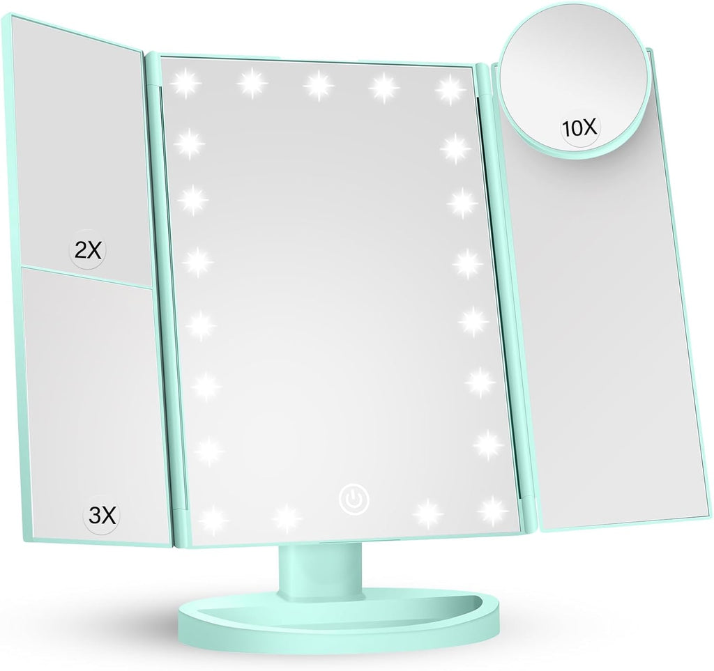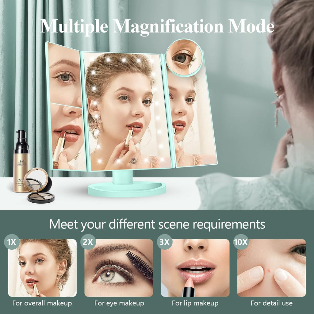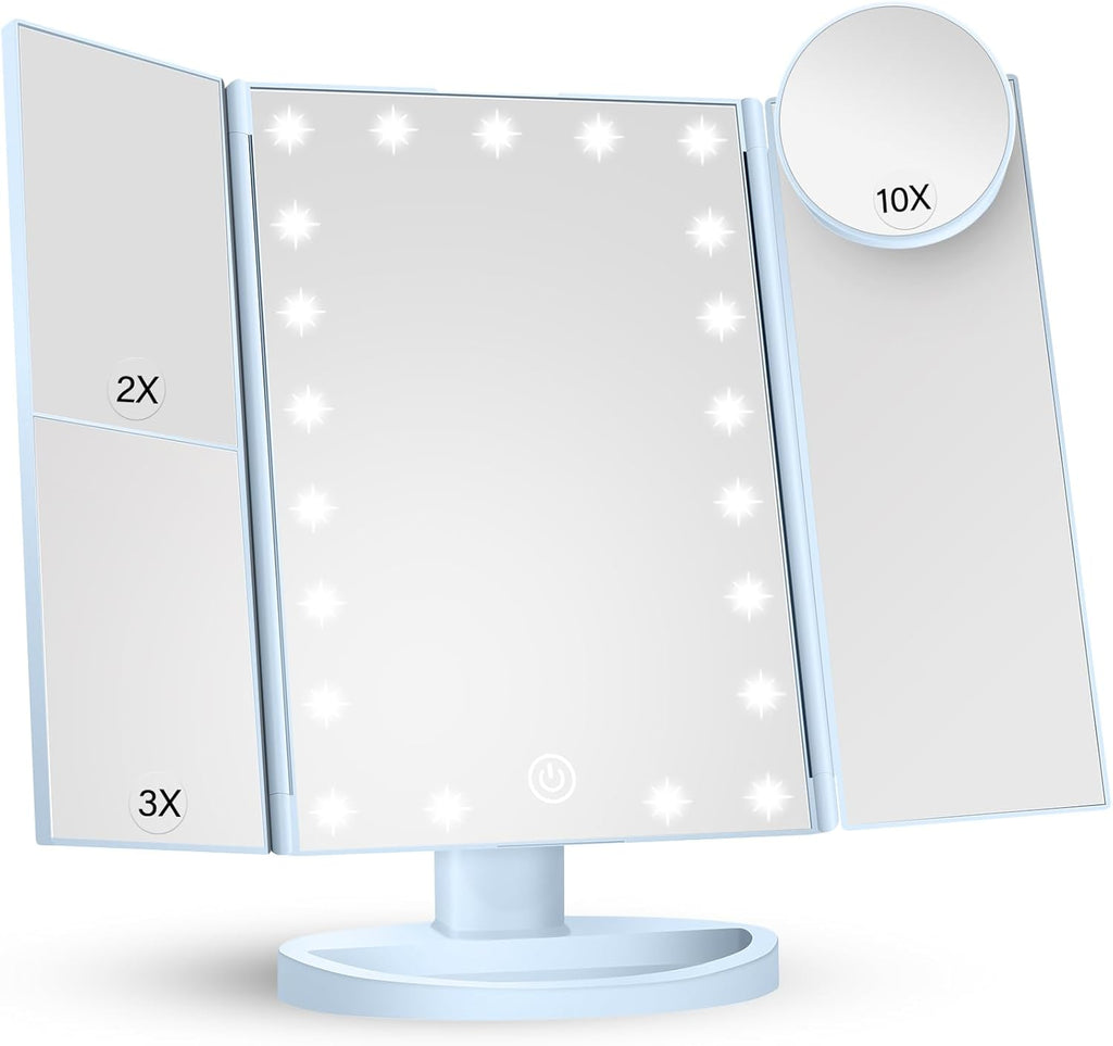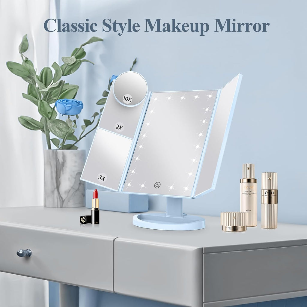Makeup Mirror Vanity Mirror with Lights, 2X 3X 10X Magnification, Lighted Makeup Mirror, Touch Control, Trifold Makeup Mirror, Dual Power Supply, Portable LED Makeup Mirror, Women Gift (White)