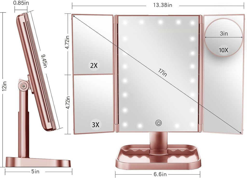 10X,3X,2X magnification modes; lighted makeup mirror has 3 panels magnifying and wide-angle viewing; see clearly your face and make a flawless makeup, suitable for desk makeup and handheld use