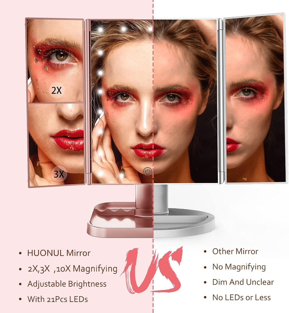 Built in 21 LED bulbs; HUONUL makeup mirror provides a good brightness for makeup; dim or brighten up the lights with a long pressing of touch screen switch